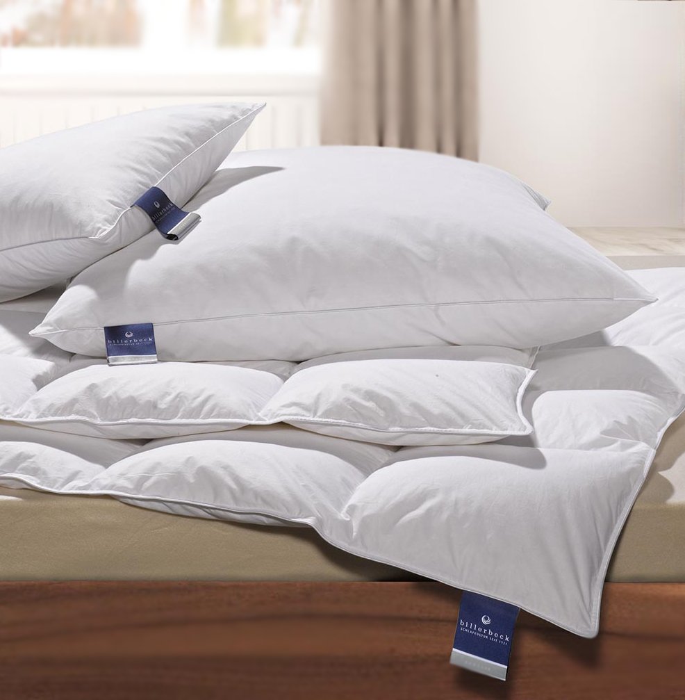 Mit der Daunendecke GABRIELA 90 von billerbeck holen Sie sich traumhaften Daunenkomfort ins Schlafzimmer. Sowohl in der Optik als auch in der Funktion ein Traumpaar: Die erlesenen Gänsedaunen und Federn harmonieren perfekt mit dem feinen Daunenbatist mit hydrophiler Ausrüstung. Kuschelweiche Daunen sorgen nicht nur für ein großes MaßGeborgenheit und Wärme sondern auch für eine gute Feuchtigkeitsaufnahme und -abgabe an die Umgebungsluft. So ist ein optimales Schlafklima - trocken und richtig temperiert - stets sichergestellt. Die Highlights der Gänsedaunendecke GABRIELA 90 auf einen Blick:Feiner Batist mit weißer Biese, 100% Baumwolle, hydrophil (Kassette IV ohne Biese)Weiße neue Gänsedaunen und -federn, Klasse I, 90% Daunen, 10% FedernOptimale Wärmerückhaltung dank großflockiger GänsedaunenHydrophile Ausrüstung des Bezugsstoffes für besonders guten FeuchtigkeitstransportTraumhaft weiches Daunengefühl für höchsten SchlafkomfortWaschbar bei 60°C und Hausstauballergiker geeignetWird in praktischer Vliestasche geliefertKassette II: Diese Einziehdecke hat einen 2 cm InnenstegKassette IV: Diese Einziehdecke hat einen 4 cm Außen,- und Innensteg - Diese Ausführung hat keine Biese.Entwickelt von der billerbeck Stiftung Schlaf & Gesundheit® Bezug: feiner Batist mit weißer Biese, 100 % BaumwolleFüllung: Weiße neue Gänsedaunen- und Federn, Klasse 1, 90 % Daunen, 10 % Federn Herkunft: Bei der Füllung handelt es sich um garantiert rückverfolgbar und zertifizierte Gänsedaunen und Federn von Tieren, die nicht lebend gerupft und nicht zur Stopfleberproduktion gehalten wurden. Mehr dazu erfahren Sie hier   SommerleichtMittelWarm Warm +Wärmepunkte1345KonstruktionSuperlightMono     Kasette IIKassette IVGrößeFüllgewicht135 x 200 cm250 g600g768 g1.032 g155 x 220 cm300 g760 g960 g1.272 g200 x 200 cm370 g890 g1.134 g 200 x 220 cm 980 g1.260 g 220 x 220 cm 1.078 g1.386 g 220 x 240 cm 1.176 g1.512 g   Daunendecke waschen – so einfach geht´s:Hier erfahren Sie, wie Sie Daunendecken richtig waschen und trocknenzum Blog-Beitragzum Video - Waschanleitung